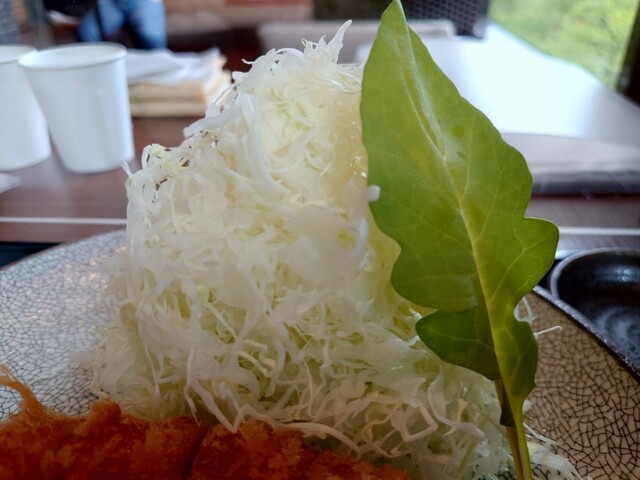 大盛りキャベツとホウレン草のような1枚葉を先に食してから「黒豚ロースかつ」をいただきます。