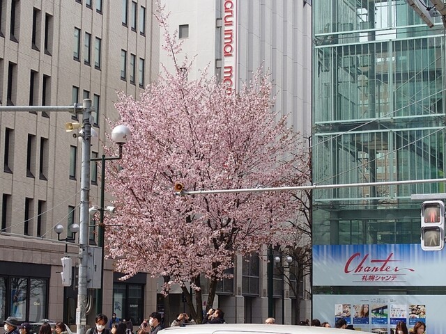 街中の桜。ガラスの反射もあって早咲き満開なのかな。