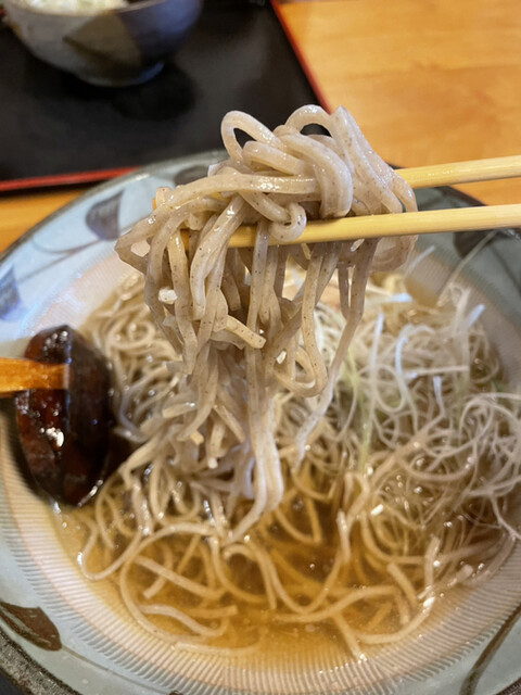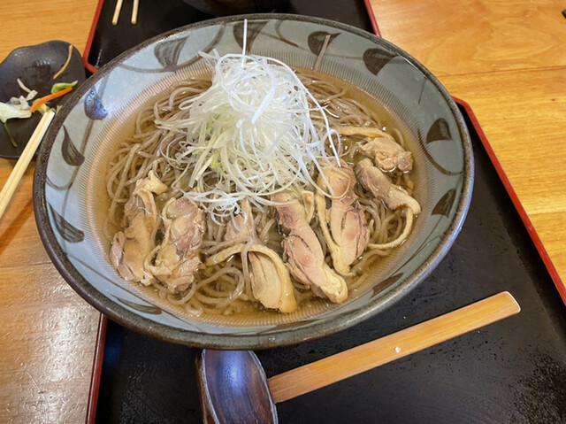 澄んだスープに白髪ネギがふんわり乗って、親鶏の薄切りと細打ちの蕎麦が上品に佇んでます。