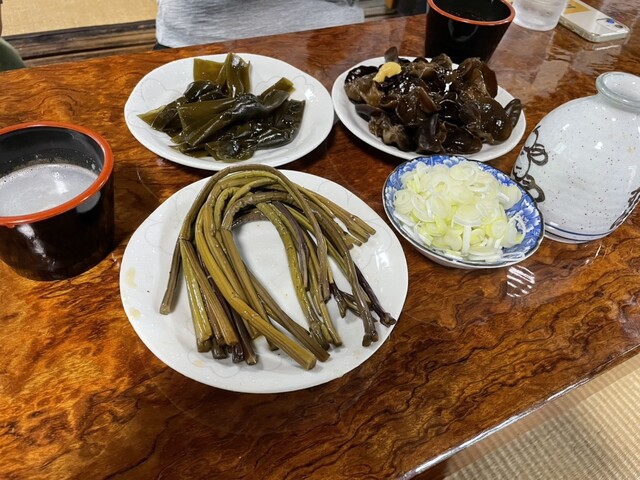 安定のわらびの醤油漬けとキクラゲのお浸し。もう一品は結び昆布の煮物でした。