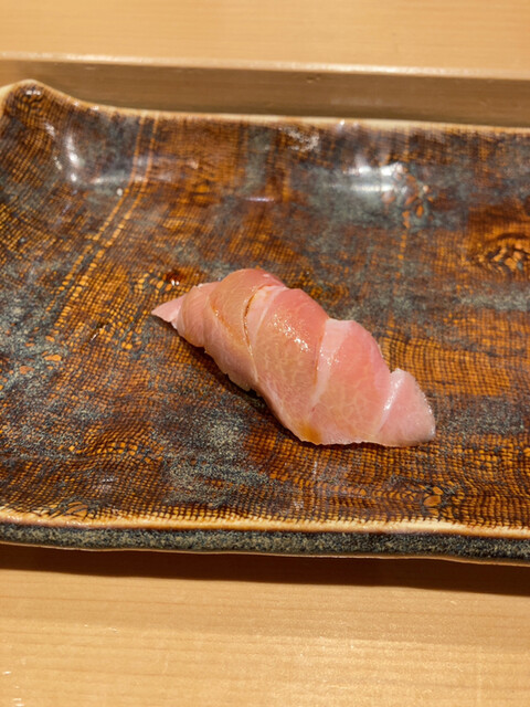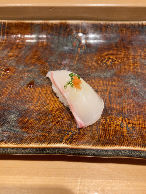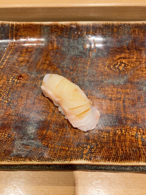 寿司は、イカから。隠し包丁が3方向でギリギリ形を保つくらい深く入っています。この隠し包丁がイカの甘みを引き出すそう。ほんのり上に振られた柚子と塩がその甘みを引き立たせます。