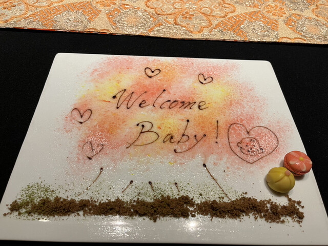 お食事どころは一休や食べログを拝見し、嵐山で京料理に創作フレンチ配合して唯一無二のお料理を楽しめるということで、嵐山ミタテさんで予約させていただきました!食べ過ぎ注意の時期ですし、お酒も飲めないので、生魚と生肉は控えることとデザートプレートにwelcome baby!を事前に伝え、ミタテコースをオーダーしました。