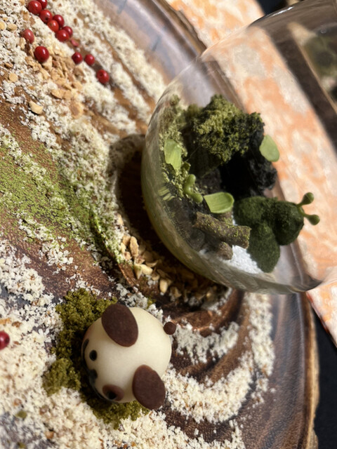 花咲か爺さん登場! カップの中の苔の庭園は盛り付けすごーい!本当にコケみたい!!と思いながら、ここほれワンワンで財宝がザクザク!グァバのプリンが出てきて、おいしー♡犬のシロもかわいい