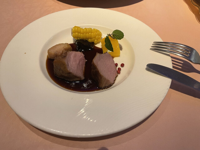 酢豚。普通の酢豚もころもがサクッと揚げられていてうまいんじゃが、最近は低温調理されたものを提供されていてナイフとフォークで食す洋食。少し噛みごたえのある肉は変則的な酢豚。