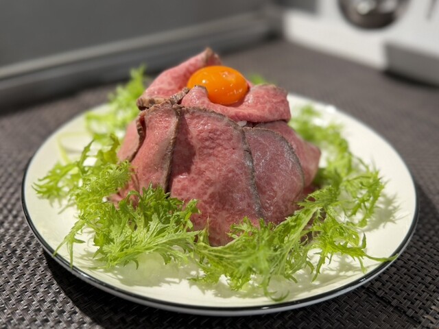 〆のご飯⑤濃厚卵黄のローストビーフ丼とわさび菜