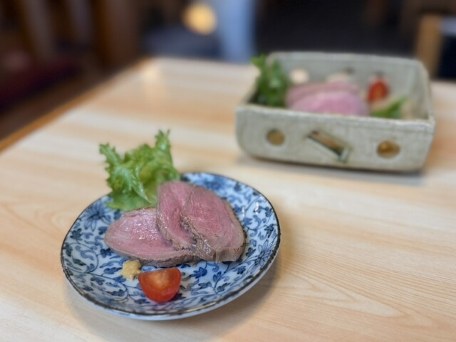 鴨ロース煮。臭み一切なし!そして少し炙ってあるから香ばしい。これ何か用紙に書くやつあって3,000円で売ってた♪