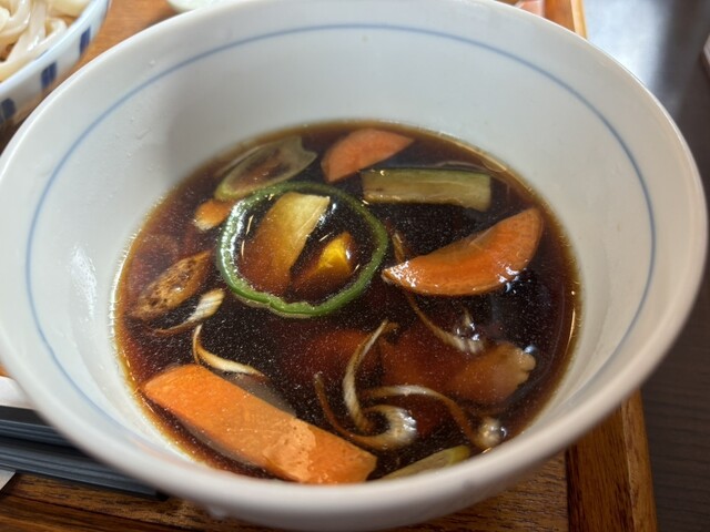 注文は名物の野菜を煮込んだつけだれのうどんと豚しゃぶのうどんを注文。