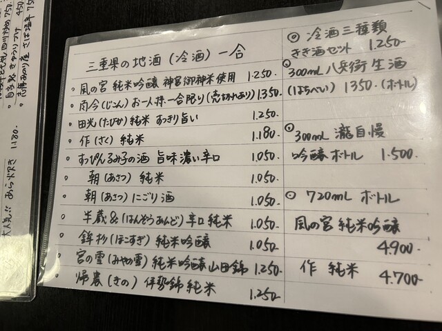 日本酒メニュー。利き酒セットは、朝・半蔵&・鉾杉でした。