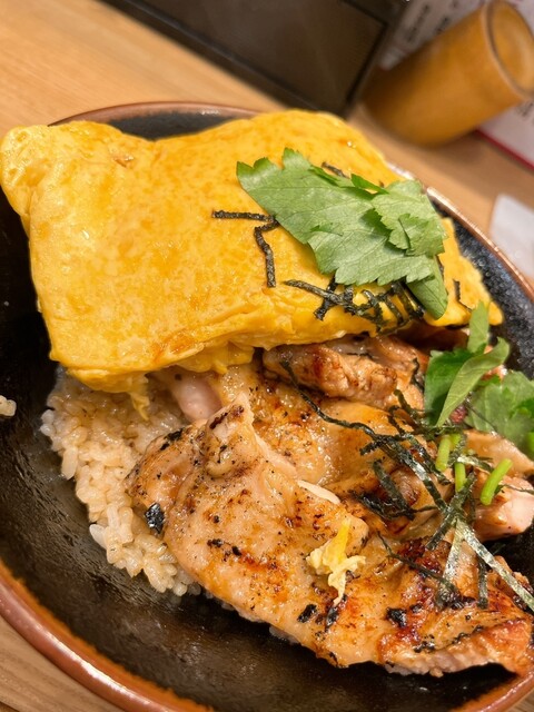 ランチに行きました。だし巻き焼き鳥丼。目の前で焼いているのが見えてテンション爆上がり!少し体にニオイがついてしまいましたが、仕方ありません。だし巻きはふわふわの焼き立てで、焼き鳥はとても大きくボリューミーなどんぶりでした!