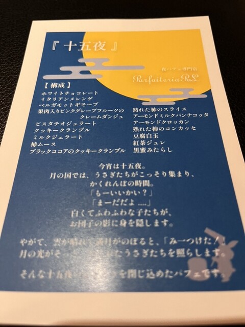 初めての夜パフェ。どれも魅力的でまず選ぶのに迷ってしまいました。せっかくなので期間限定の十五夜とコーヒーを注文。うさぎモチーフで中身もしっかり説明してくださり、最高のバッジ夜パフェでした。次回はフルーツのパフェにしたいです。