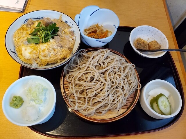 せいろ、小親子丼、お新香、小鉢、甘味、蕎麦猪口に入ったツユ、