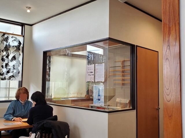 清潔感のある和モダンの落ち着いた店内の奥にガラス張りの蕎麦打ち場があります。