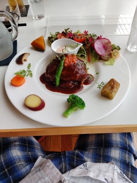 ハンバーグランチのコースを注文しました。写真を見てもらうとわかるんですが、盛り付けがとても綺麗なんです。まず、ジャガイモの冷製スープ、丁寧に裏ごしされていてバターがきいていて喉ごしもよいです。自家製パンは、オーガニックオイルを付けて食べると味わい深いです。メインのハンバーグは、厚手のパティに上手く火が通っていて肉汁もあふれとてもおいしいです。付け合わせのにんじん、かぼちゃ、なす、ししとう、きのこも丁寧に味付けされていて、堪能できました。最後にデザートの小豆ケーキですが、バニラアイスが乗っていてとても可愛です。おしゃれで、素敵なお店です。ご馳走様でした。