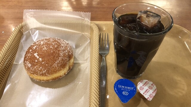 カフェスペースで、紅芋サーターアンダギー、アイスコーヒーをいただきました。