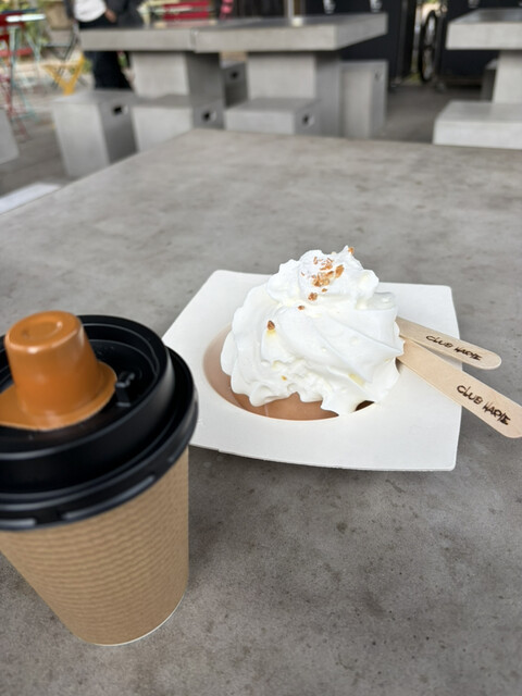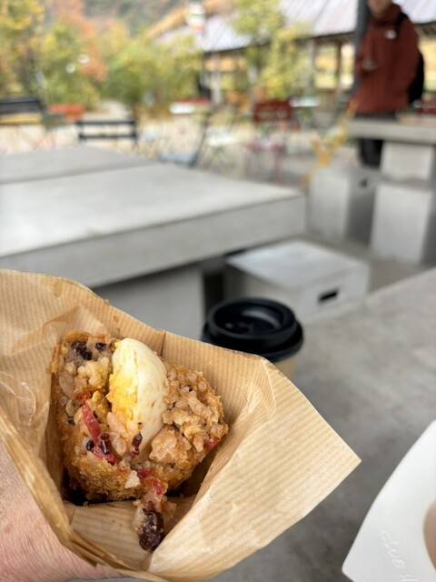 フードコートでライスコロッケ、コーヒー、バームクーヘンにホイップクリームを乗せたものをいただきましたが冬に外で食べるのは寒い。