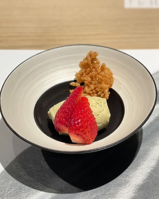 温かいお茶と同じ緑茶のアイスクリームとあまおう。