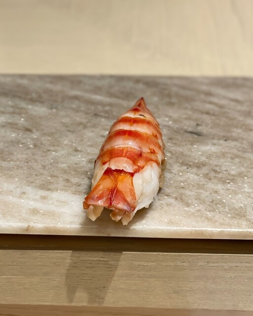 ・沖縄の車海老。目の前で見せてくれた後に皮を剥いて握ってくれます。あとで頭の部分を塩焼きして出してくれます。海老の風味がどこまでも続く。