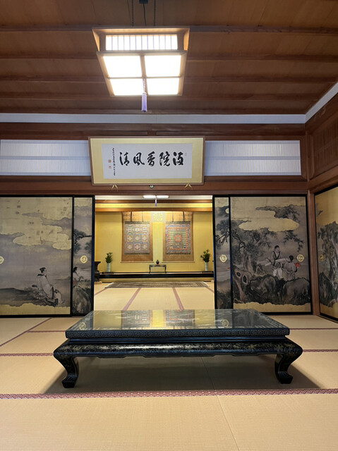 美しい襖絵や掛け軸、螺鈿のテーブルにうっとり。奥には曼陀羅が拝観できます。