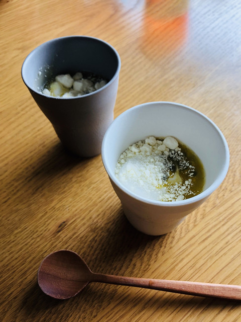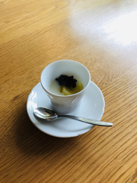 貝柱と里芋のエスプーマ。チンゲン菜が柔らかくて味が濃い♡
