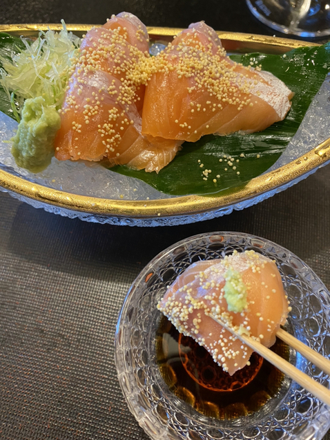 新鮮なビワマスのお造り!卵も贅沢に振りかけられています。