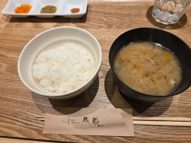 たっていてツヤツヤなごはんと豚汁がめっちゃ豚の味がして美味しい。