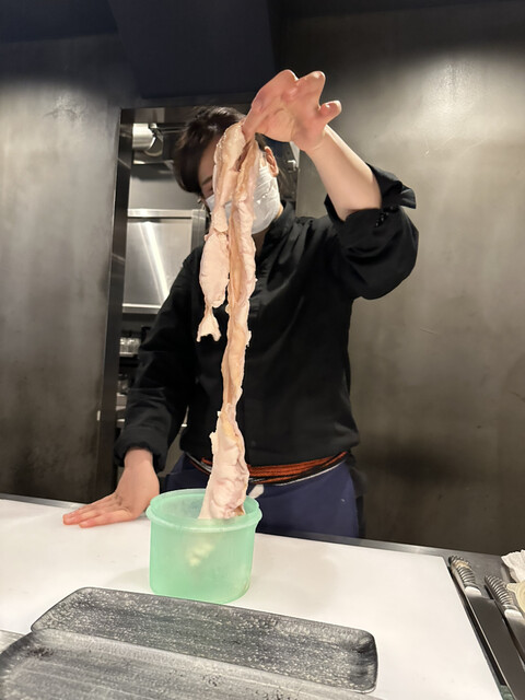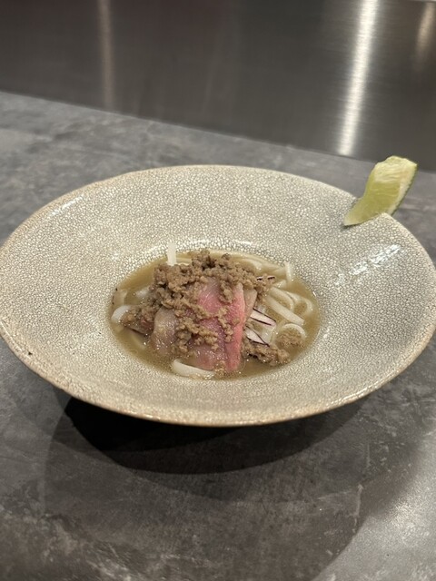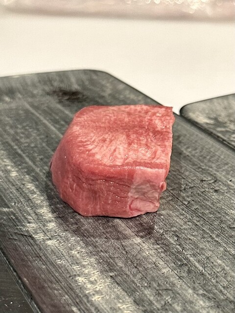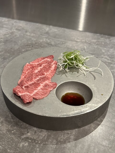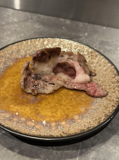 コースの序盤で提供される「ツラミ刺し」は、綺麗な隠し包丁が入っており、噛むたびに肉の旨味が口のなかに溢れ出る一品でした。