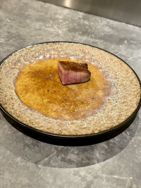 「ツラミ刺し」の次に提供される「八寸の盛り合わせ」は、すべての料理に牛肉が使われています。どれも印象的でしたが、「熟成肉の串カツ」の濃縮された旨味が他の料理を圧倒していました。