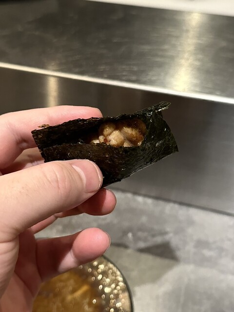 「シビレの海苔巻き」は、旨みが詰まったシビレ(胸腺)を香ばしい海苔で包んだ一品。ひと口噛むごとに旨みと磯の香りが広がります。