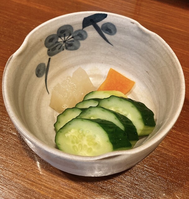 前菜-キュウリのお浸し・釜揚げシラス・カラスミとスルメイカ・ワサビ漬け・エシャレット-
