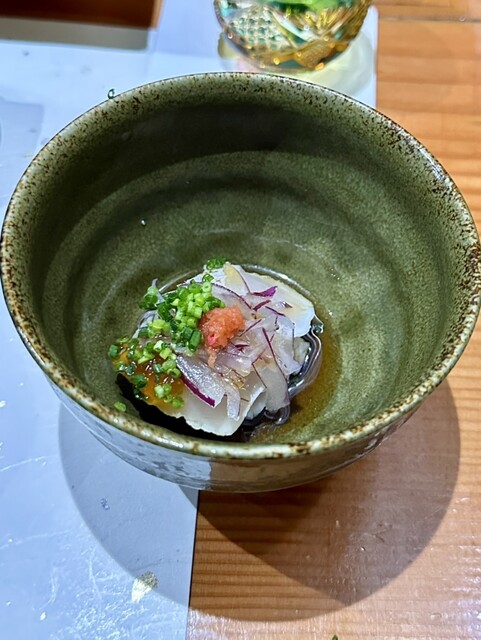 コースの終盤で提供される「メジマグロ」は、マグロの漁獲可能時期が、他の都道府県と比較して短い鹿児島県では、1年間を通してほとんど提供されません。"うっとり"するほど、美しい隠し包丁が入った一貫で、後味が抜群に良かったです。