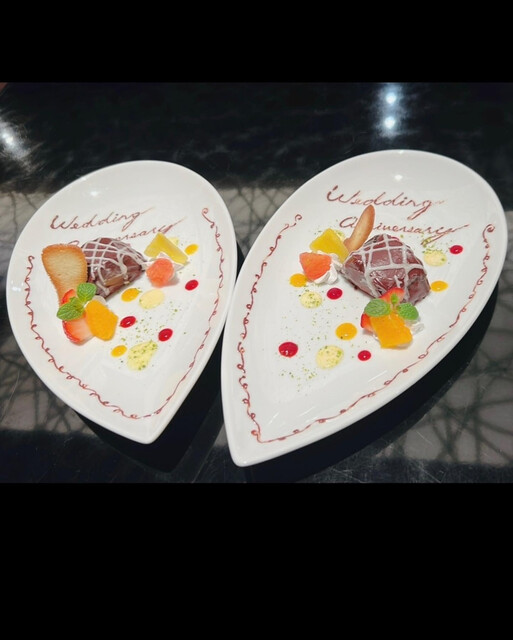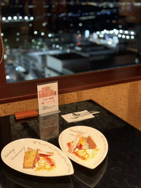 デザートはまた別のお部屋で明石大橋が見れる側へ移動して、プレートにメッセージと写真をプレゼントしていただきました。ありがとうございましたとっても美味しかったです。ごちそうさまでした。