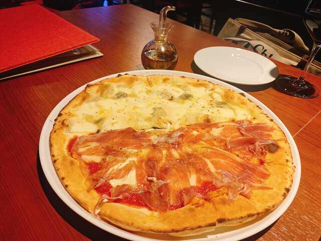 ・ポルチーニクレーマー(ポルチーニクリーム、キノコ7種、モッツァレラ)と、7種のチーズのピッツァのハーフアンドハーフ