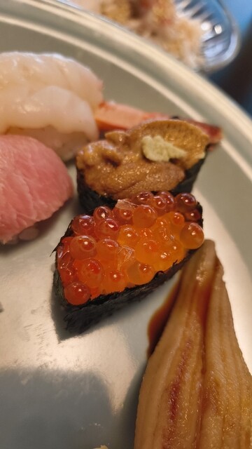 赤身 中トロ 大トロ サーモン いか あなご 蒸し海老 光り物 真鯛かな? イクラ うに 玉子 ネギとろ 沢庵まで(^o^)♪