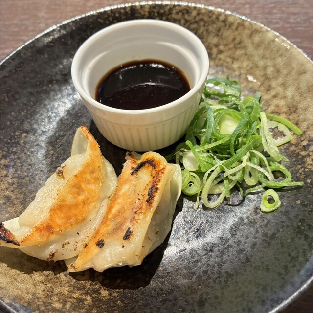 ・広島県産瀬戸のもち豚餃子(一口サイズの焼き餃子、ネギを添えて)