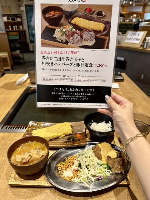 ランチでおすすめしたいのが巻き立て出汁巻き玉子と粗挽きハンバーグと豚汁定食(1,290円)