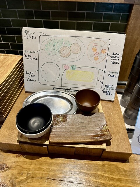 バイキング形式でスープ、ご飯らポテトサラダ、サラダ、ハンバーグ2つ、出汁巻玉子を回収していきます◎
