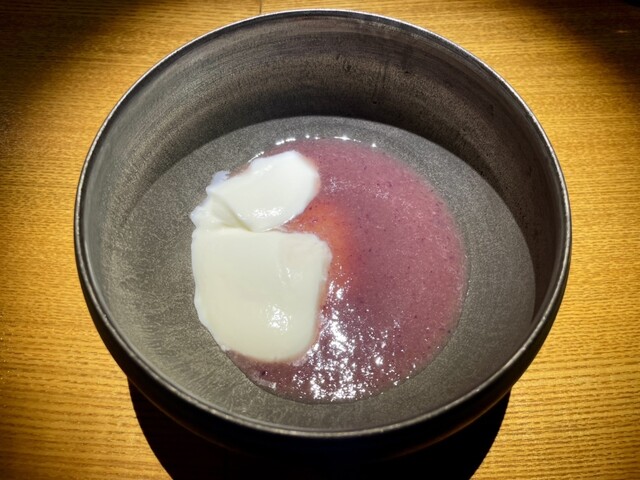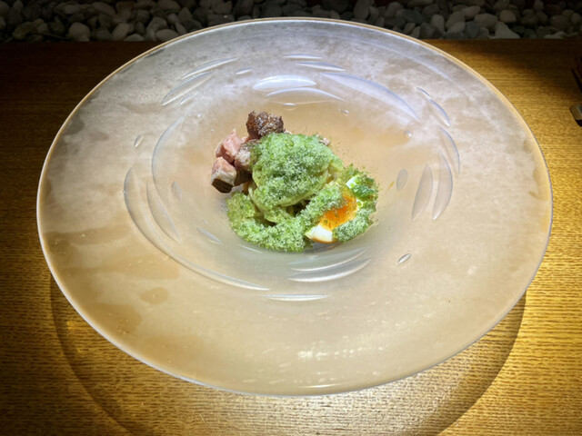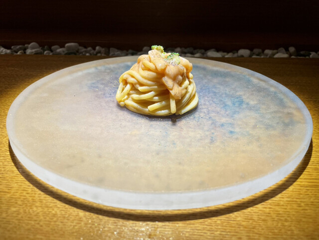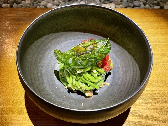 いつもはこのタイミングでお口直しが入りますが、この時期限定でパスタが入ります。タイトル通り、隼さんがパスタを作りたいだけ(笑)ただ、この枸杞の実と温泉茄子のソースが激うますぎて、、、もう一度大盛りで食べたいんですが、隼さんは二度と同じもの作らないのでね...(泣)