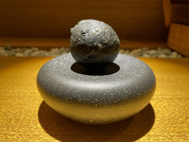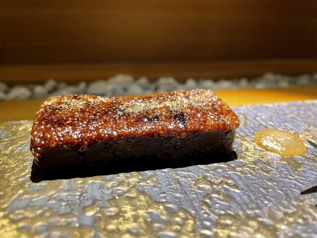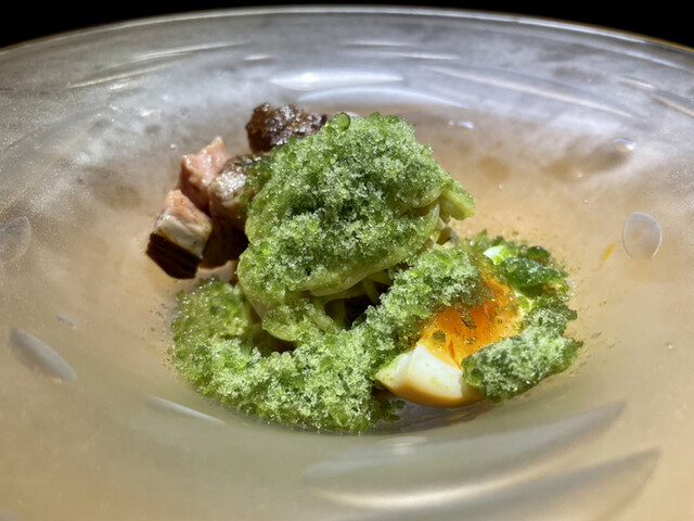 とうもろこし、毛蟹、黒鮑の冷たい茶碗蒸し。それぞれの食材に異なるアプローチを施しているそうなんですが、説明がいつも通り理解不能領域。ただ、人生で最も贅沢な茶碗蒸しだったことは間違いないです。卵からうまいもん...