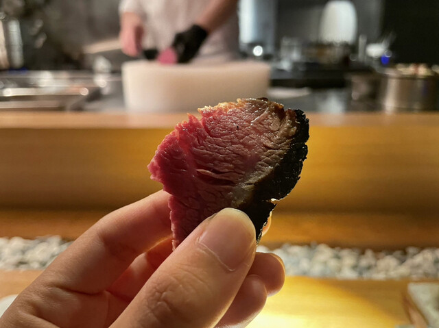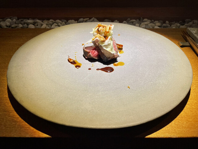 メイン二つ目は、中国黒酢に漬け込んだ和牛フィレ肉の炭火焼き。メイラード反応だとか何℃でたんぱく質が凝固するだとか、隼さんの詳しすぎる説明を「この人何言ってんだろ?」と思いながら聞くのが好きなんですよね。わからなすぎて笑えてきますw
