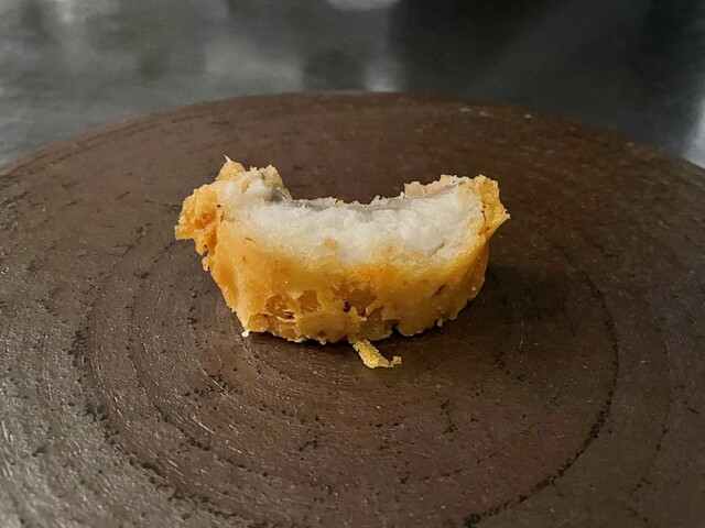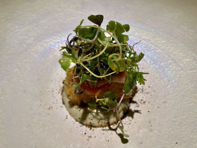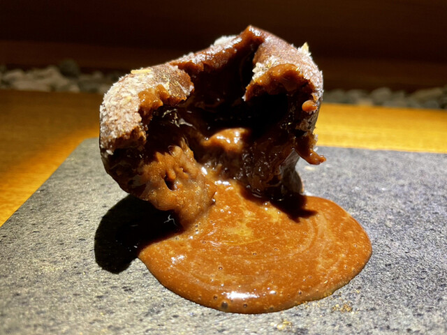 フィレオフィッシュという名の太刀魚のフリット。ベニエ生地に自家製x.o醤を混ぜているので、噛んだ時の上品な香ばしさがなんとも!追いx.o醤に黒トリュフまで削られて、気を抜くと香りだけで昇天します。暴力的な旨さ!!