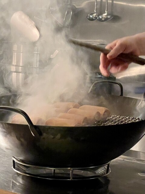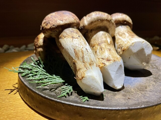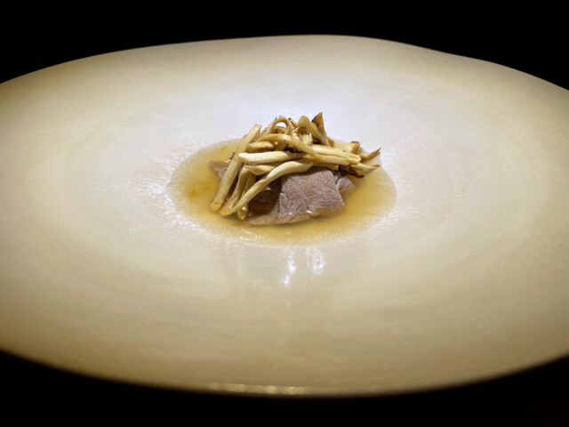 山形牛フィレ肉の湯引き。松茸のお出汁。レタス。松茸の備長炭蒸し焼き。鹵水(ルースイ)を掛けて。炭の香り漂う松茸から和食テイストを感じつつ、鹵水によって中華に引き戻される感じ。贅沢すぎる和と中の融合なり!