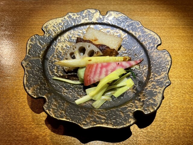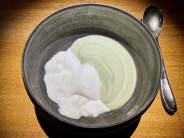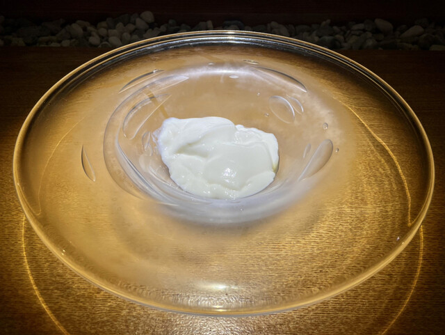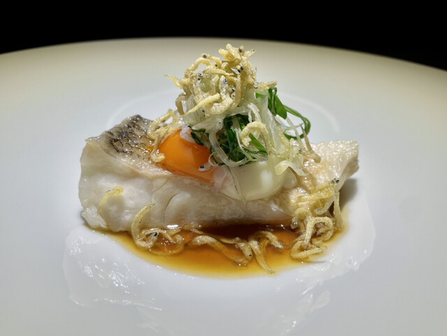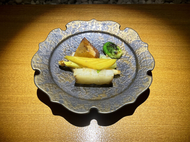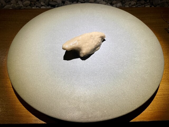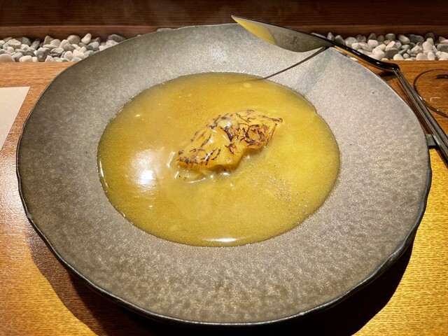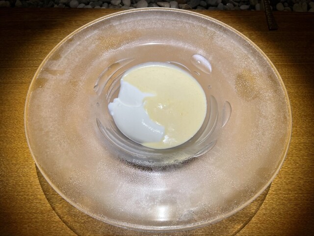 島原素麺にピュレ状のあやめ雪蕪を合わせた、タイトル通り白一色のお口直し。あえて少し物足りなさを感じるよう仕上げており、メイン料理に移る前のリセットの役割。シェフはコースの調整役だから美味しくないと言うけれど、毎回ちゃんと美味しいんだよなぁ。前にも書きましたが、バントの構えでホームランを打つようなシェフなんです。