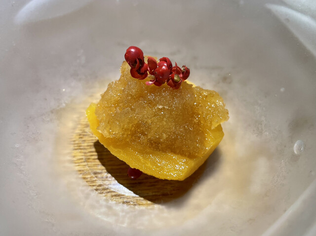 金糸瓜とクラゲの和え物。梨のグラニテ。グレープフルーツの果肉。青山椒のパウダー。口内の温度を一旦下げるための調整役なので「美味しくないよ、期待しないで」