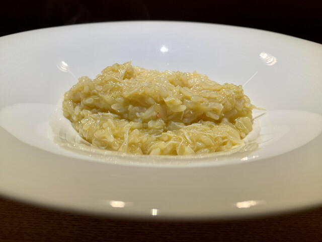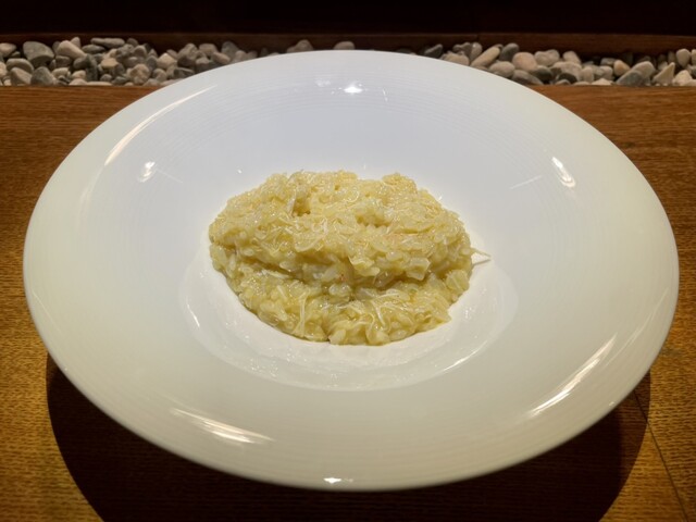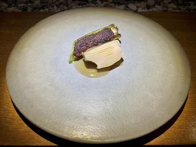 岩手県吉浜産干し鮑。一年前にシェフ自ら吉浜に赴き、1個1個目で見て触って確保してきたものだそう。12日間かけて戻す鮑のエロさたるや。圧倒的な旨みと弾力は忘れられません!