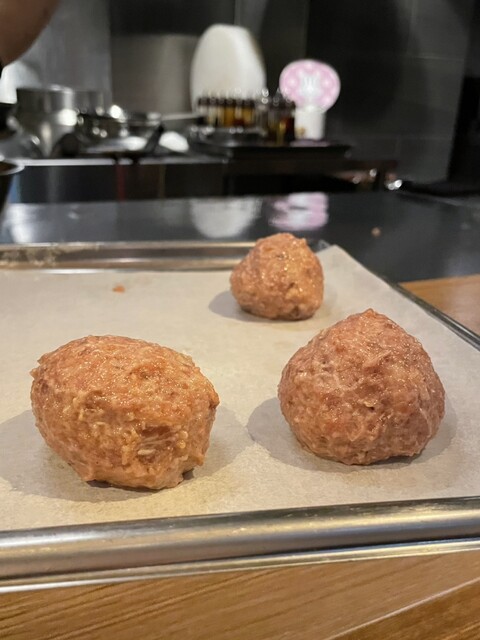 中国伝統料理の獅子頭をイメージ。和牛サーロイン、イベリコ豚の豚トロ、茨城県産美明豚のヒレを使った肉団子。にらめっこの相手は上海蟹。ソースがめちゃめちゃ美味しかったです!