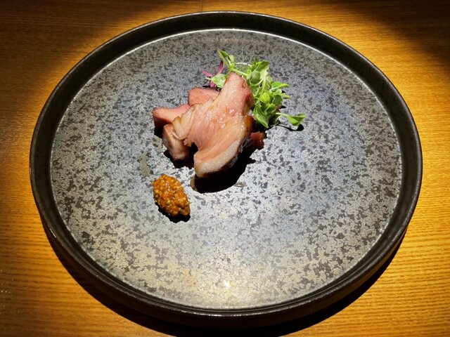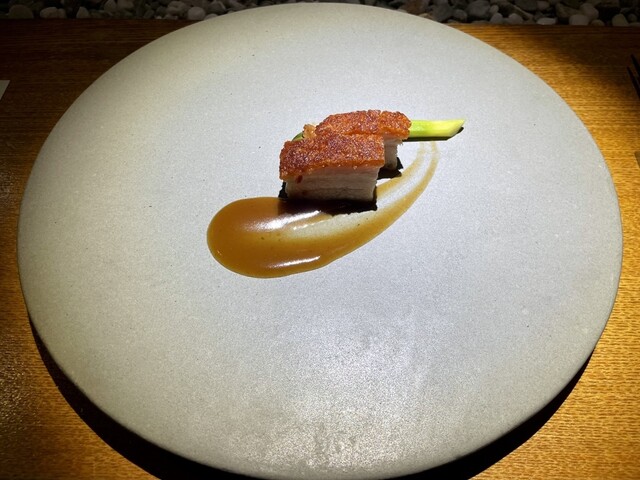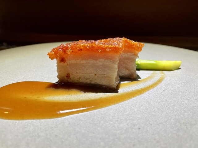 今宵のメイン一つ目は、虎河豚白子のカツレツ。下から順に、栃木県産温泉茄子のピューレ、白子フライ、あいち鴨ロースの生ハム、フレッシュトマトのチリソース、北海道菅原農園さんハーブという構成。理解不能な方法で下処理された白子は臭みがなくとろっとろ。クリーミィな白子を旨味で引き締めるあいち鴨の存在がとても良かったです。前に食べた黒鮑のカツレツも忘れられませんが、白子のカツレツも全く違うアプローチでアーティスティックでした←