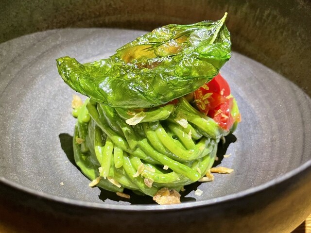 ほうれん草、フレッシュバジル、揚げたベルギーエシャロットで作ったジェノベーゼソース。静岡フルーツトマトの紹興酒漬けが最高だったなぁ♡