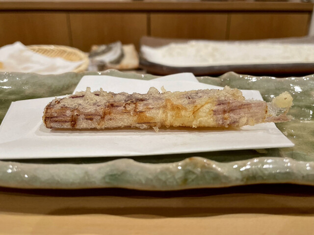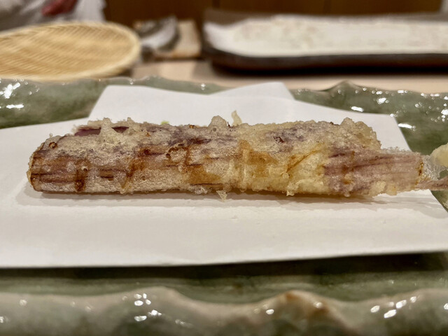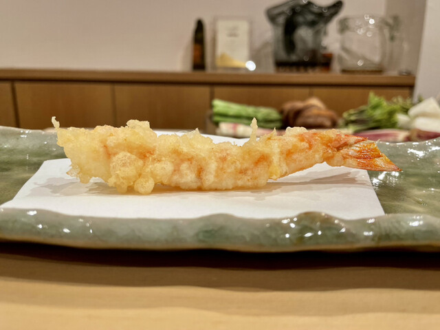 天ぷら屋ではなかなか出ないサイズの特大車海老。甘みは控えめなものの、噛み締めた時の旨みが抜群です。