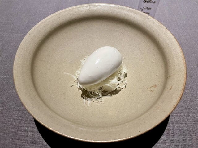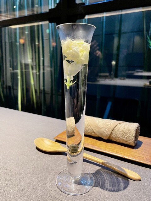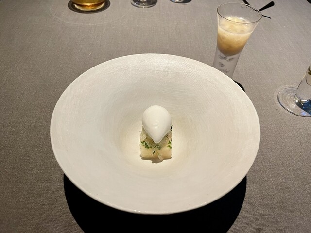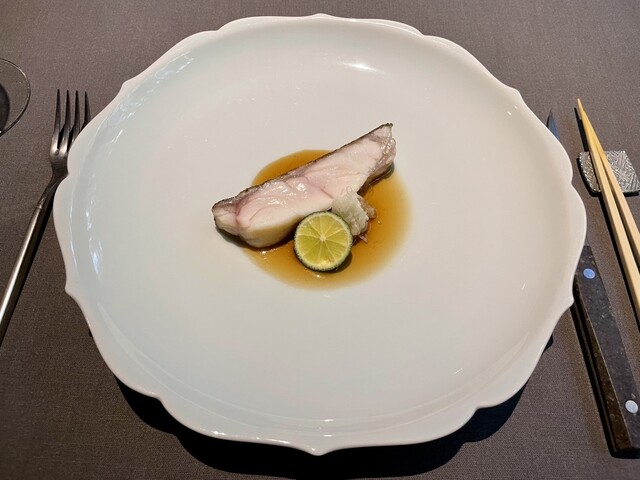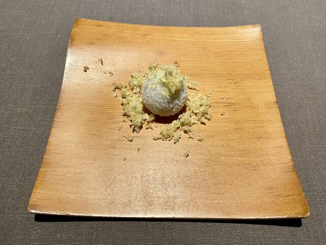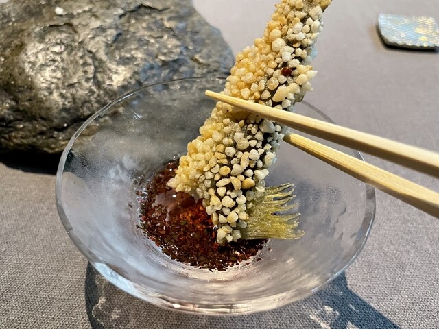 お酒に漬けた鮎のあられ揚げ。岩に見立てたお皿に乗って登場です。食感も風味も最高に美味しかったのですが、驚いたのが蓼酢。スイカの果汁が不思議と合いましたね。初体験でした...