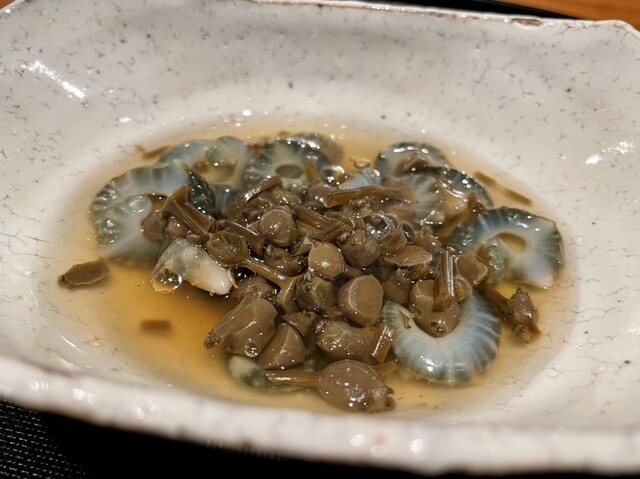 ◉青海鼠、醤油漬けしたみずの実、鰹出汁